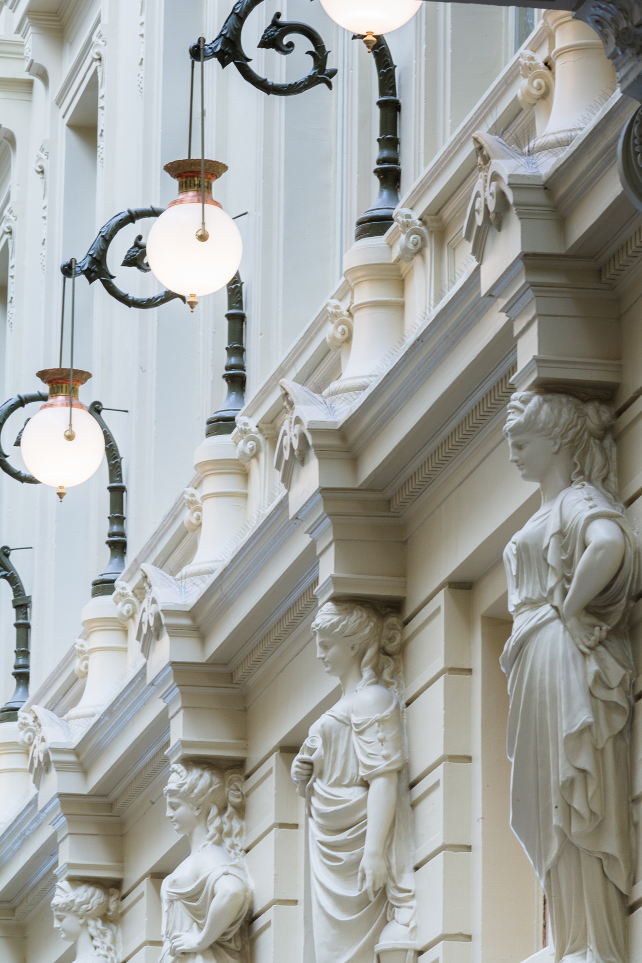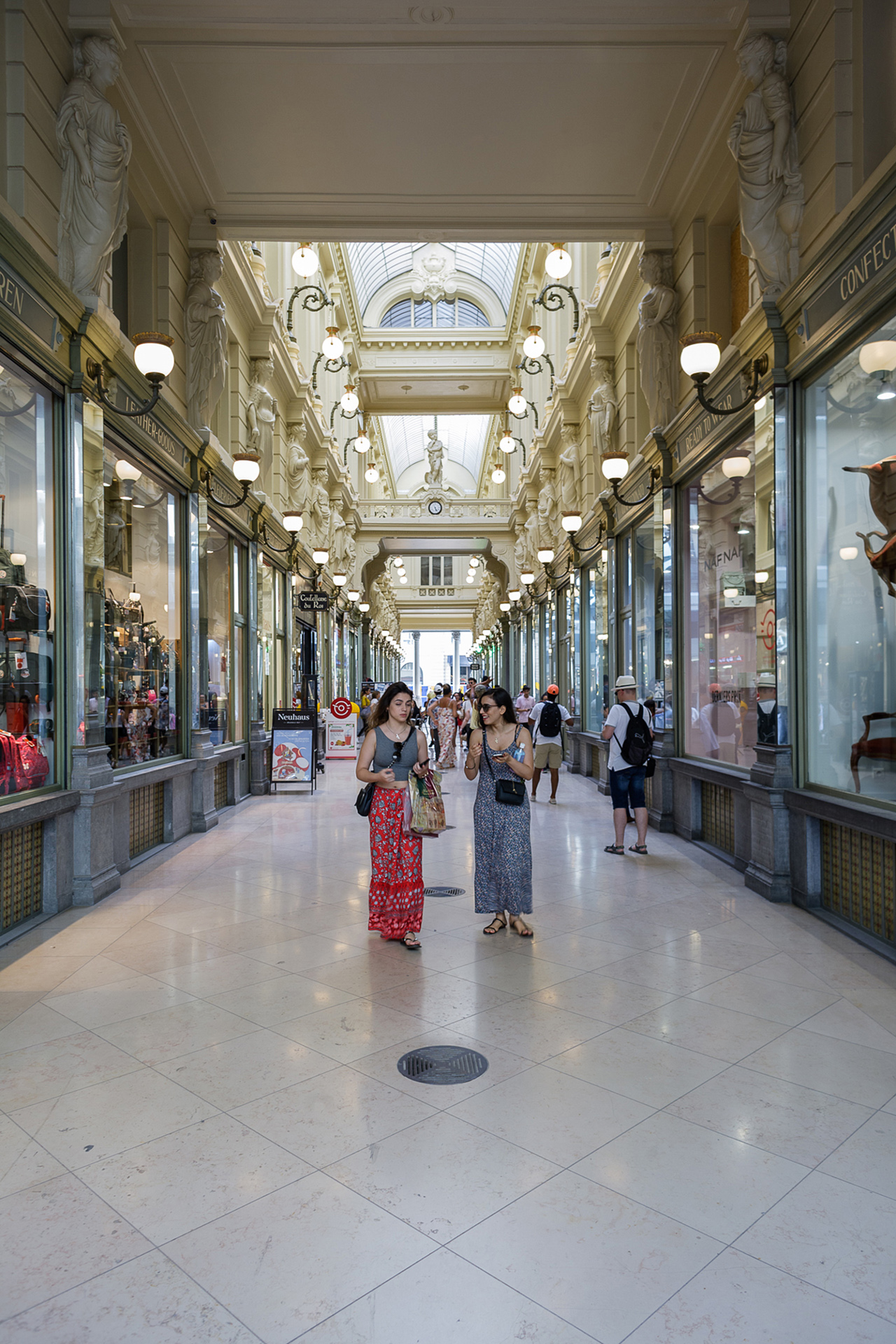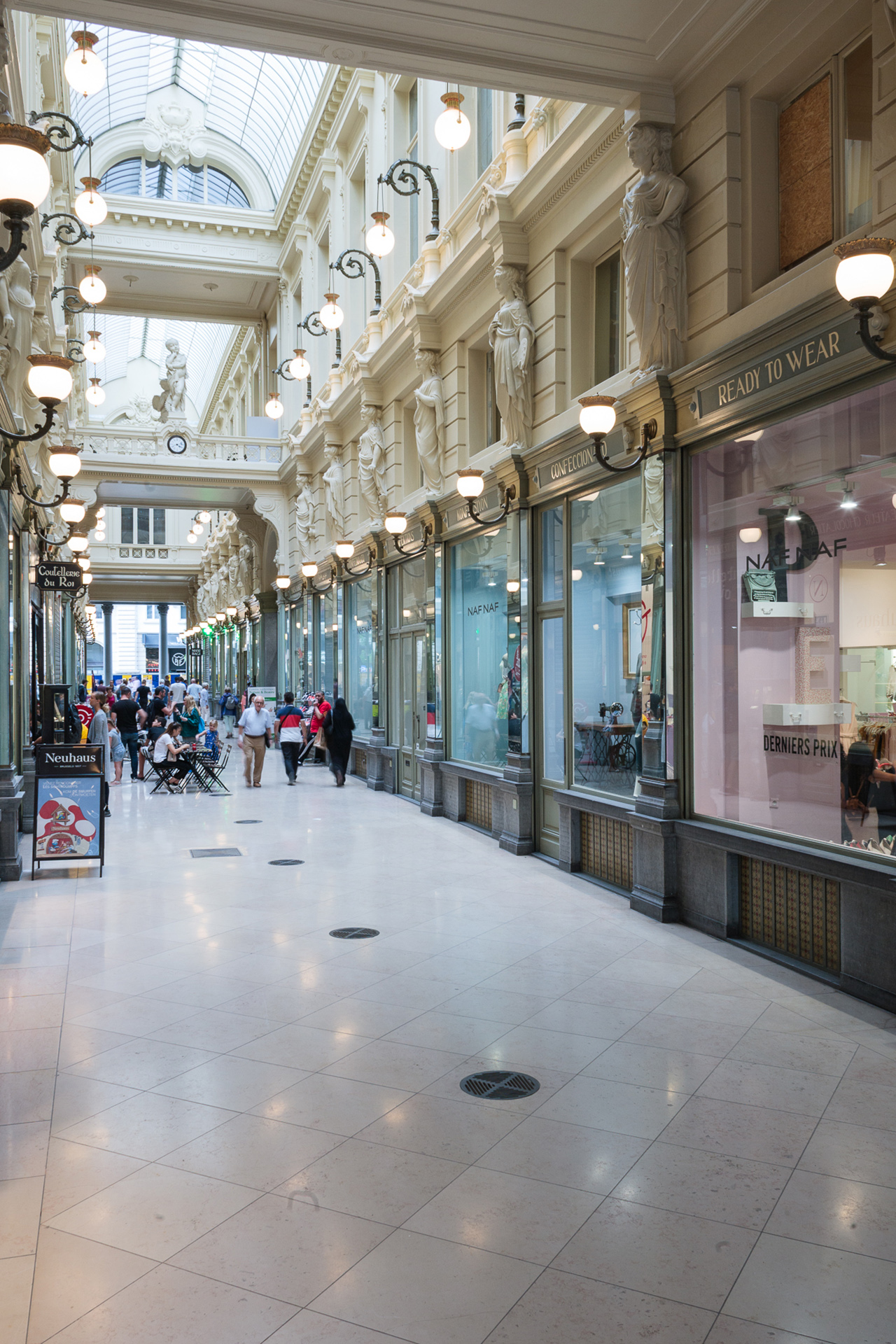 The two columns at the entrance of the Passage, on the side of the boulevard Adolphe Max set up at the start of the 20th century, were carefully reconstructed in 2005 to look like the original in order to recreate the architectural consistency of the entrance.